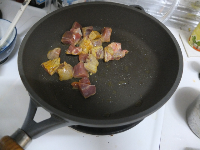 1.在解凍的豬胛心肉上灑咖哩粉,按摩一下